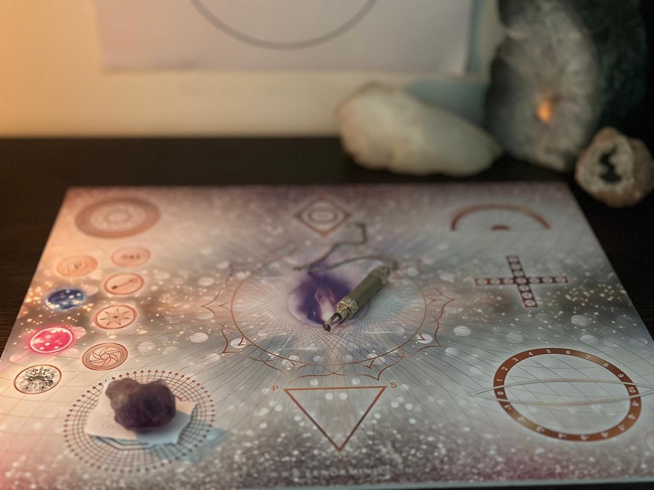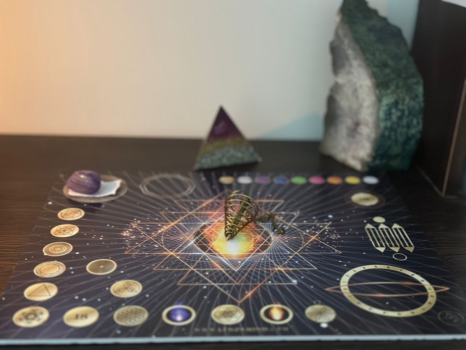 La Mesa Cuántica Lovers es una herramienta con forma de tablero radiónico que contiene figuras basadas en geometría sagrada,